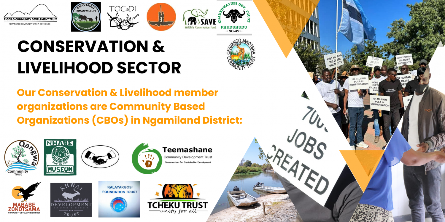 CONSERVATION & LIVELIHOOD SECTOR – This sector exists to build a Ngamiland society that is eco-sensitive, guarantees equitable access to wealth creation opportunities, develop a culture that places premium on the protection of the environment and indigenous knowledge as well as focusing attention of both public and private sector on issues that promotes sustainable use of natural resources in the development process.